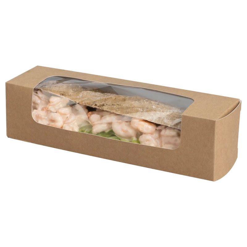 Caja bocadillo con ventana. Ecológica y 100% reciclable. Acabado kraft con ventana, es un envase perfecto para bocadillos baguette de hasta 26,5 cm.