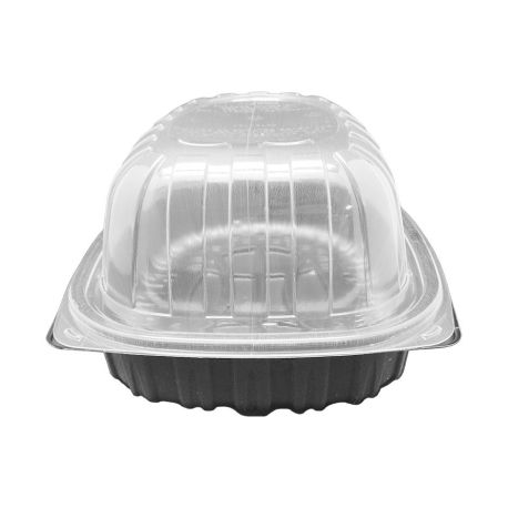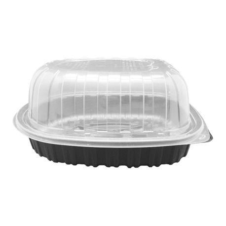 Base negra de PP y tapa en OPS cristalino. Especial para comidas calientes, y para calentar en el mismo envase.